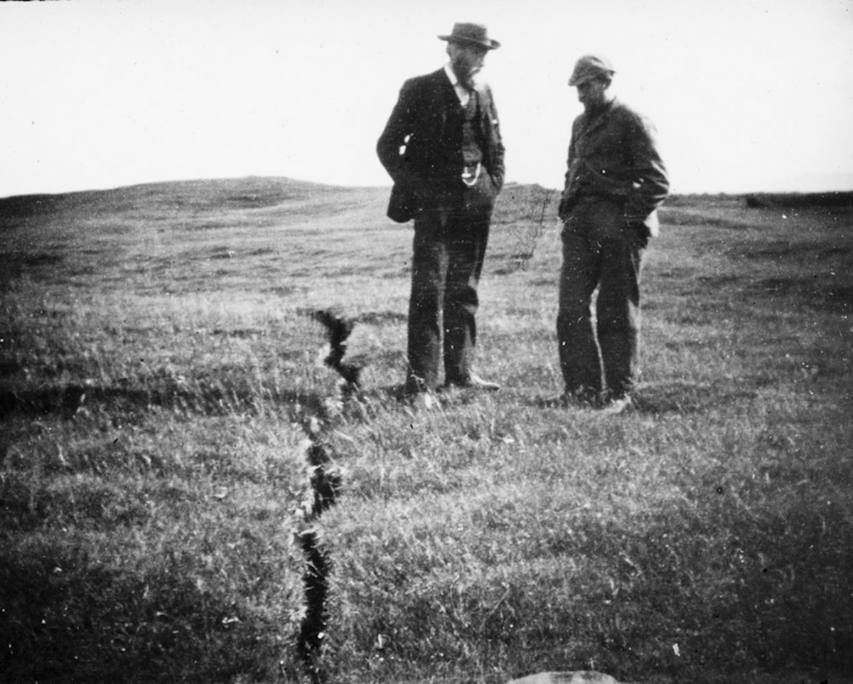 Fellsmúli - jarðskjálftasprunga í grónu landi, tveir karlmenn standa við hana.