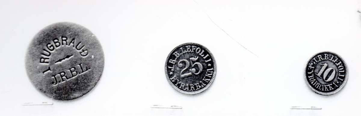 Brauðpeningur fyrir einu rúgbrauði og tveir vörupeningar; 25 og 10.