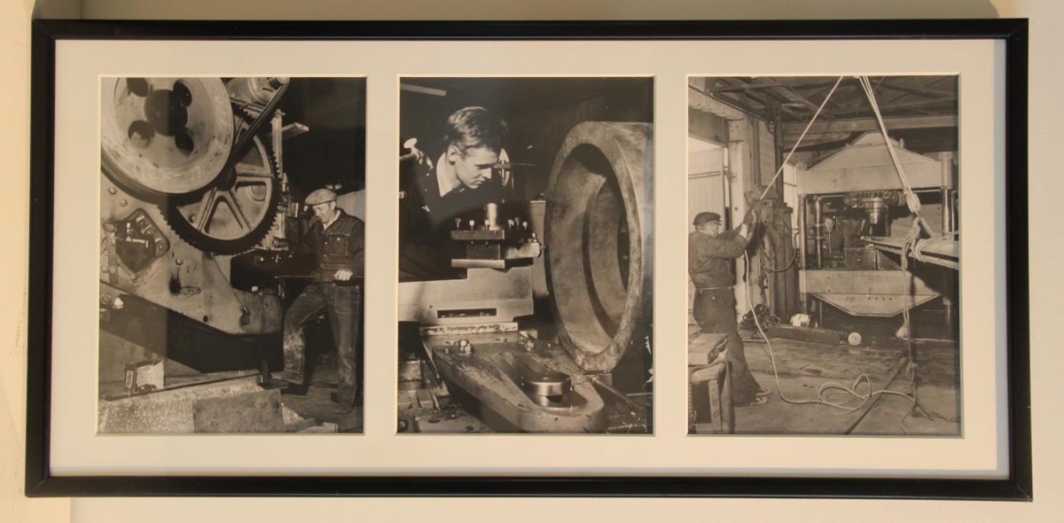 Myndirnar eru svart/hvítar undir gleri í svörtum ramma. Þær eru úr Vélsmiðjunni Atla á Akureyri, teknar 1965. Frá vinstri: Aðalsteinn Magnússon er að „lokka“, Páll Möller er að renna stimpilhringi í gufuvél og Reynir Lyngdal er að rétta bita í pressu. Í bakgrunni stendur Magnús Stefánsson. Myndirnar hafa sögulegt gildi.