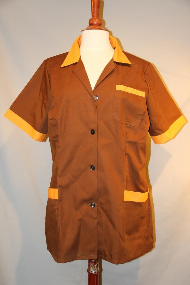 Sloppurinn er 3/4 síður. Hann er brúnn með gulum kraga og bryddingum á ermum og vösum. Efnishlutföll: Bómull 35%, pólýester 65%.