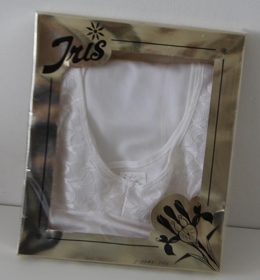 Gylltur kassi með svörtu prenti. Texti: Tegund: Náttkjóll - Teg nr. 62. - Efi polyammide - Litur 2 - Stærð: 42 - Íris Akureyri. Framkvæmdarstjóri og aðaleigandi Íris: Jón TRyggvason.