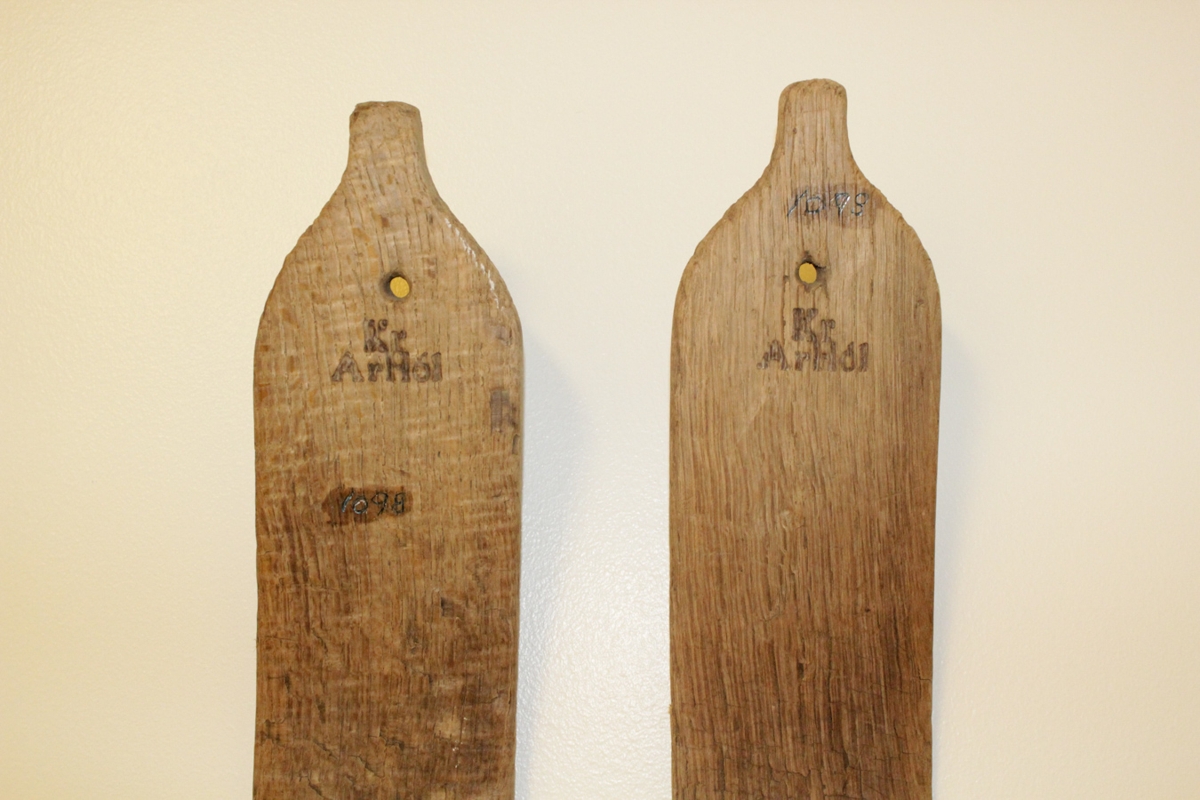 Tréskíði með bindingum yfir ristina. Járnlykkjur ganga inn hliðar skíðanna og þar í gegn fara leðurbindingarnar. Þær eru festar saman með reipi. Í annað skíði vantar eina ólina. Í skíðabogana er stimplað " Kr Árhóll ". Í skíðabogunum eru göt.