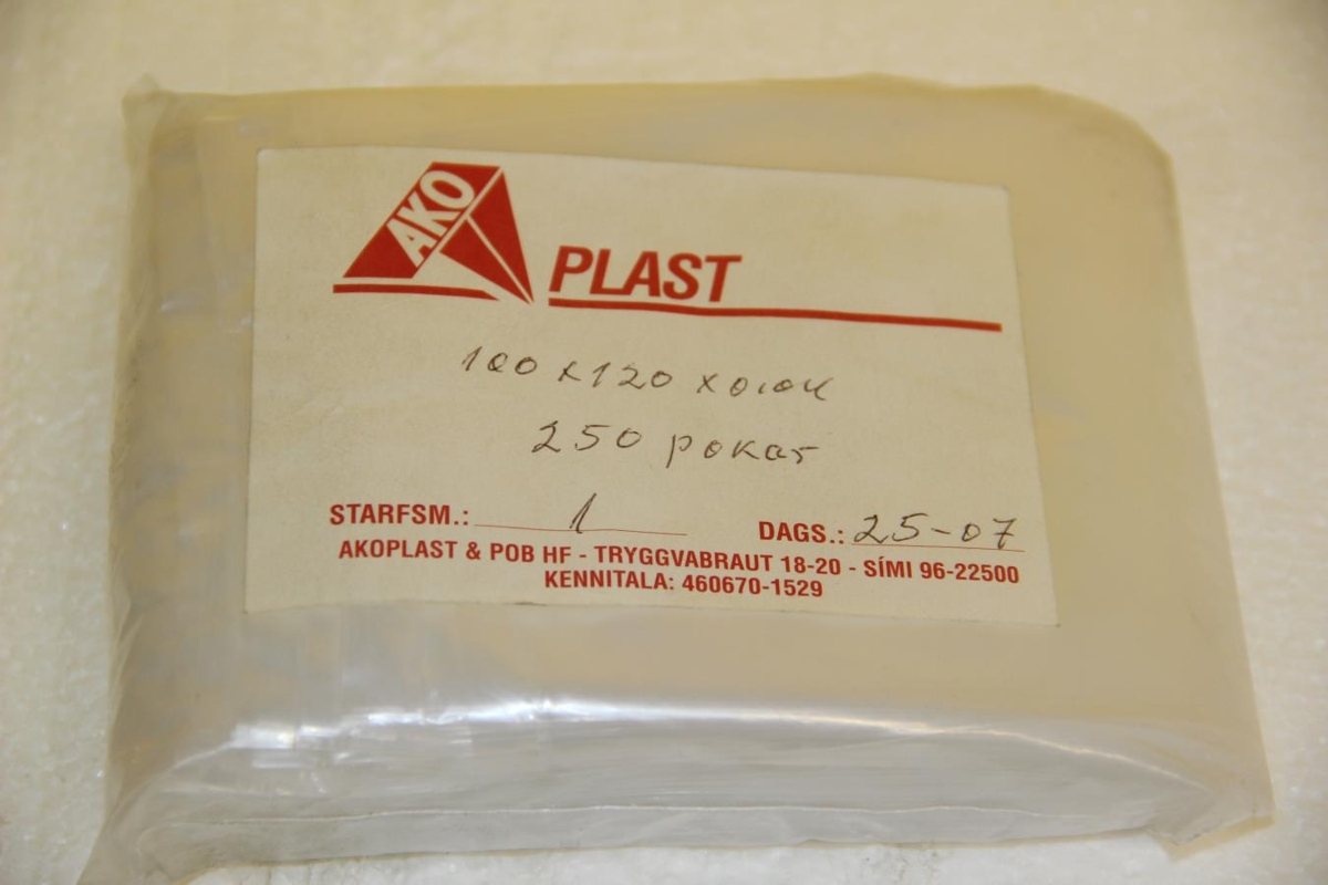 Plastpoki með 250 pokum í. Álímdur hvítur miði með rauðu letri og svartri handskrift. Handskrifað: 100 x 120 x 0104 (sennilega millimetrar) 250 pokar. Áletrun: Starsm.: 1 - Dags. 25.-07. Akoplast & Pob Hf Tryggvabraut 18-20. Sími: 96-2500. Kennitala: 460670-1529.