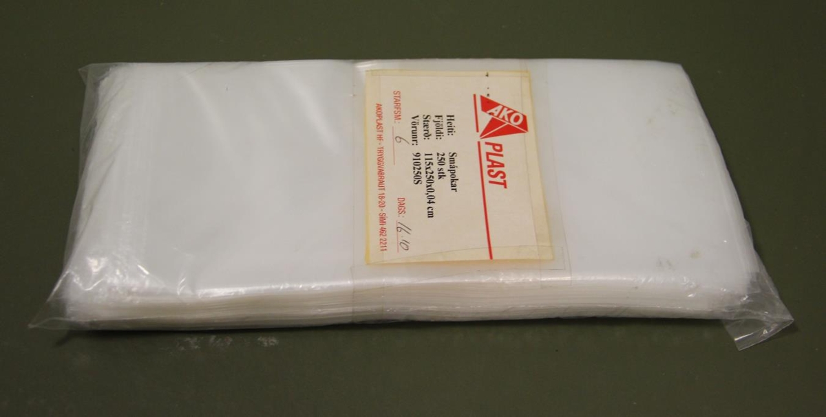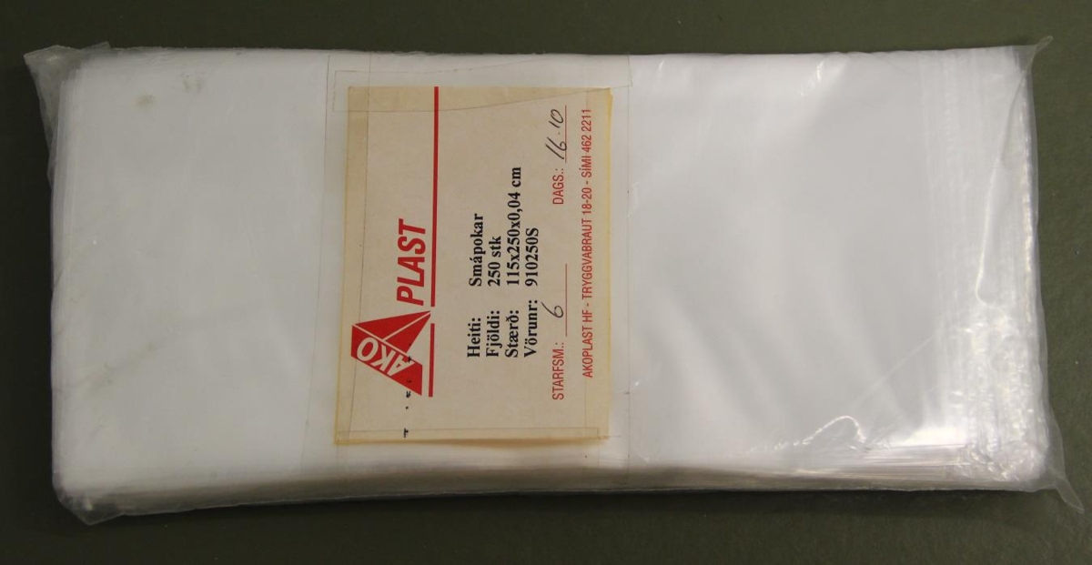 Plastpoki með 250 pokum í. Álímdur hvítur miði með rauðu og svörtu letri. Áletrun: Ako-plast. Heiti: Smápokar. Fjöldi: 250 stk. Stærð: 115 x 250 x 0,04 sm. Vörunr..: 910250S. Starfsm.: 6. Dags. 16.10 - Akoplast hf. Tryggvabraut 18-20, sími 462 2211.