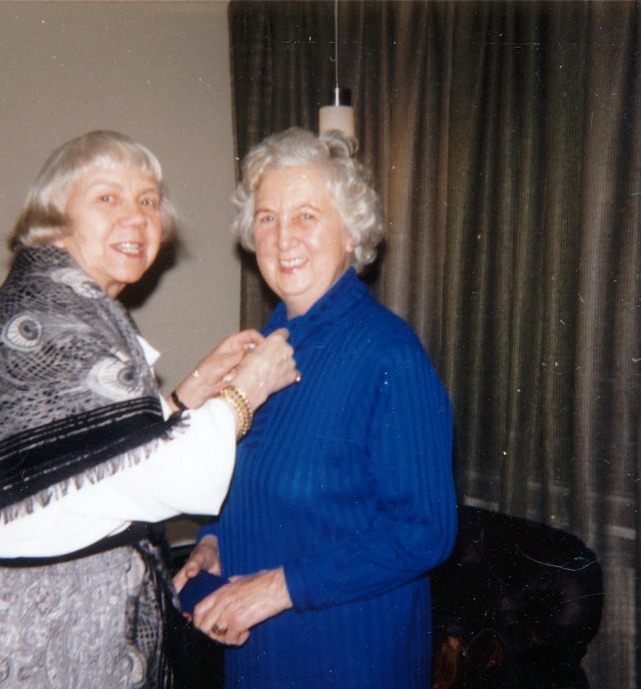 Freyja Bjarnadóttir (1911 - 2006) var sæmd fálkaorðunni árið 1987 fyrir störf að félagsmálum. Þessi mynd var tekin heima hjá Guðrúnu Björnsson þegar Freyja fékk fálkaorðuna.