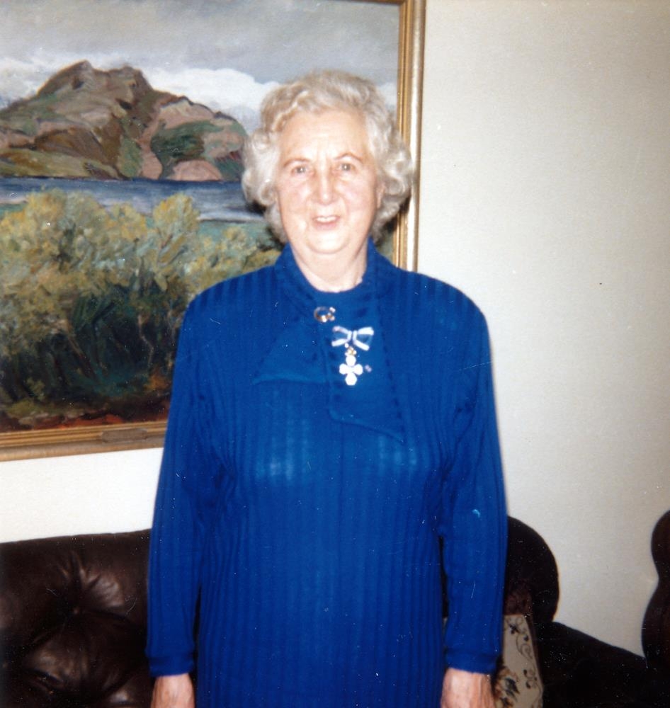 Freyja Bjarnadóttir (1911 - 2006) var sæmd fálkaorðunni árið 1987 fyrir störf að félagsmálum. Þessi mynd var tekin heima hjá Guðrúnu Björnsson þegar Freyja fékk fálkaorðuna.