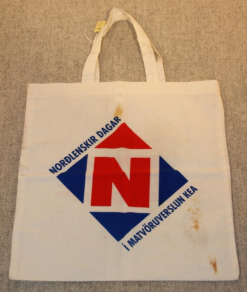 Innkaupapoki með hvítum höldum. Áletrun: KEA Kjötiðnaðarstöð - Norðlenskir dagar í matvöruverslun KEA.