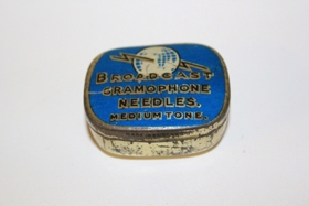 Málmbox með áföstu loki sem er blátt. Á lokinu stendur " BROADCAST GRAMOPHONE NEEDLES MEDIUM TONE ". Ekki er hægt að opna boxið svo ekki er vitað hversu margar nálar eru í boxinu.