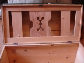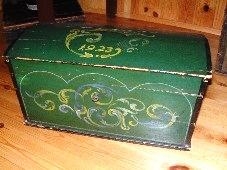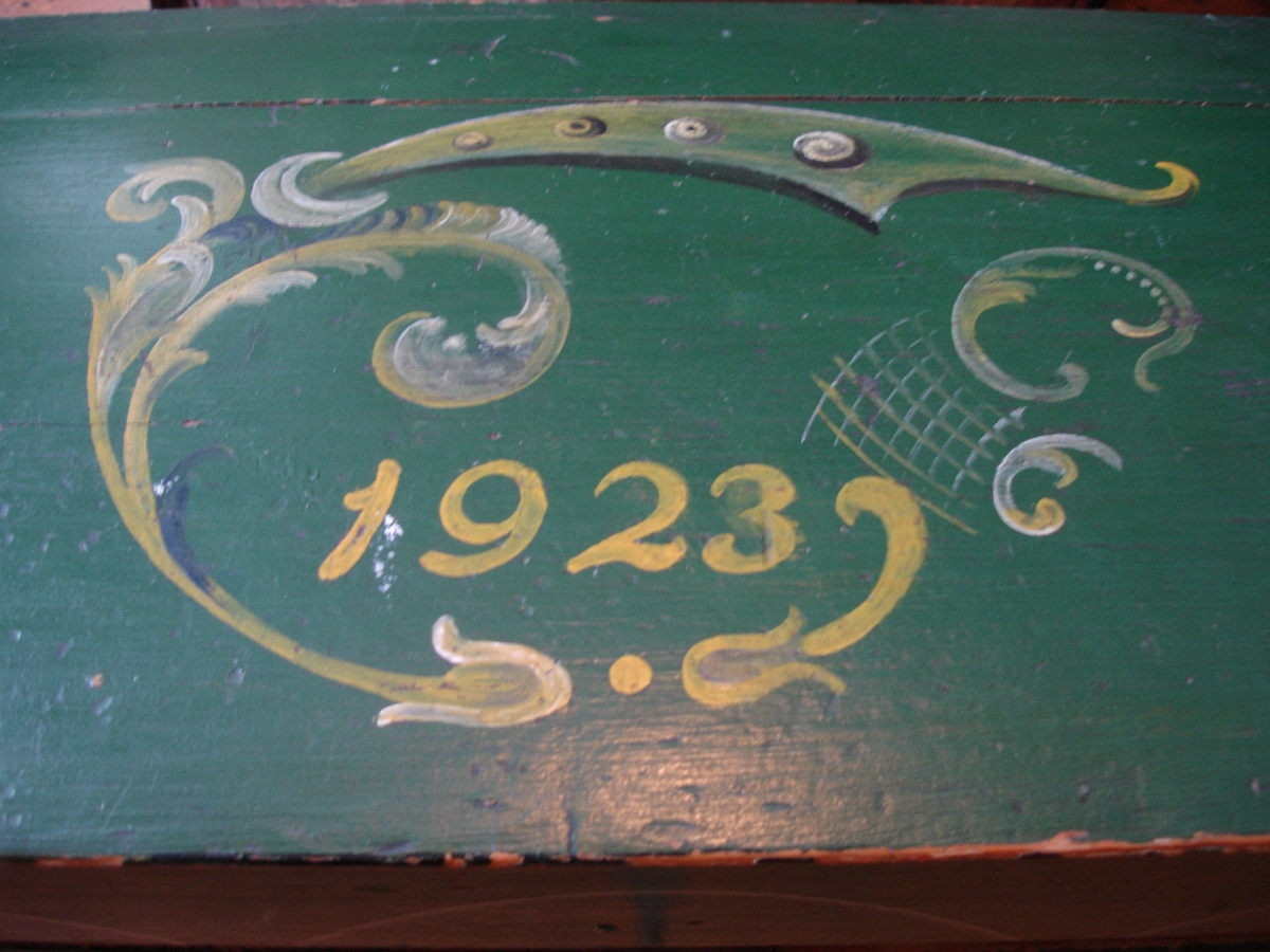 Skrautmálaður trékistill. Gefandi gaf einnig annan lítinn kistil (sjá mun nr 1418). Kistilinn er með kúptu loki sem hægt er að læsa með skrá og lykli. Hann er málaður grænn í aðallit með skrautmynstri í gulum og grænum lit á hliðunum og að framan. Ofan á lokinu er málað skrautmynstur og ártalið "1923". Innan á lokinu er viðarrammi með þremur fjölum sem renna til í raufum þannig að það myndast geymsluhólf að baki þeim.