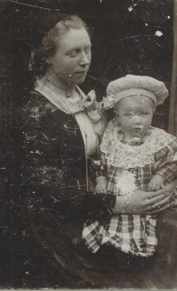 Sigurbjörg Einarsdóttir húsfreyja í Vík í Mýrdal með barn í fangi.