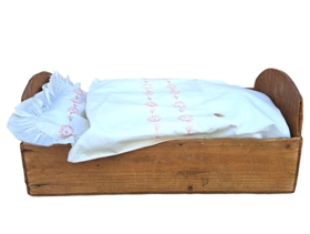 Dúkkurúm úr eigu Soffíu Þórðardóttir (f. 18.02.1949). Soffía segir að rúmið hafi verið gamalt er hún eignaðist það í kringum 1955. Rúmið er úr við, ómálað og virðist sem efsta fjöl á annarri hliðinni hafi brotnað af. Er í sæmilegu ásigkomulagi. Enginn merki eru um að fætur hafi verið undir rúminu. Rúmið gæti hugsanlega hafa verið notað áður sem einhverskonar hirsla undir t.d. saumadót ? Stærð L. 35 cm B. 15 cm H. 15 cm. Gefandi Soffía Þórðardóttir. Kemur 29.08.1996.