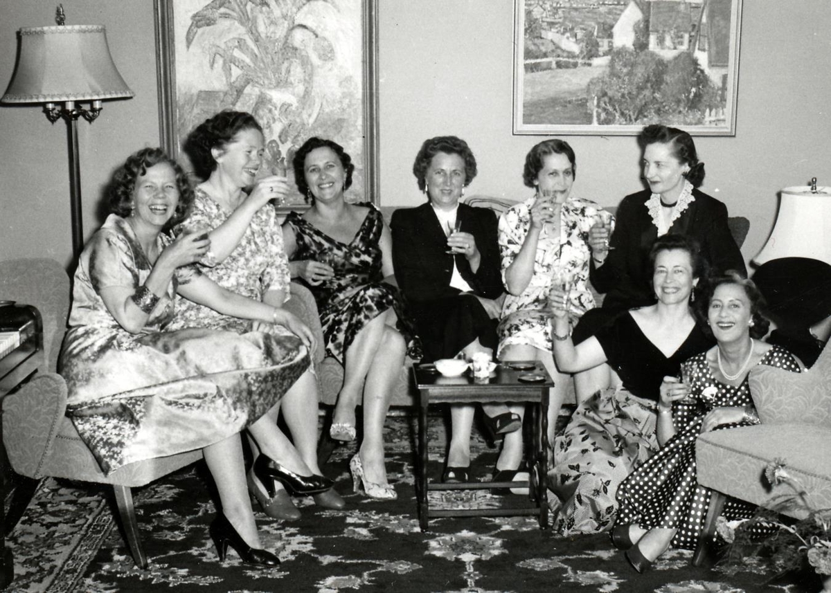 Myndin er tekin á heimili frú Rögnu Björnsson og Sigurðar Guðmundssonar, framkvæmdastjóra Hörpu h.f. að Ásgallagötu 24 í Reykjavik (ÞSÞ, 2019). Frá vinstri: Guðrún Laufey (Blaka), Ragna, Margrét, Freyja, Guðrún Þórdís, Guðrún Árnadóttir, Unnur, Obba.
