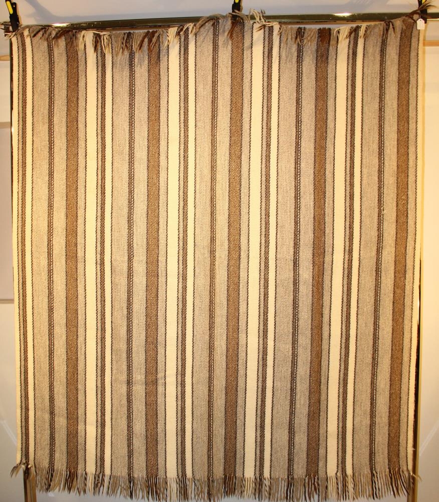 Teppið er kögrað, langröndótt í brúnum, gráum og hvítum litbrigðum.