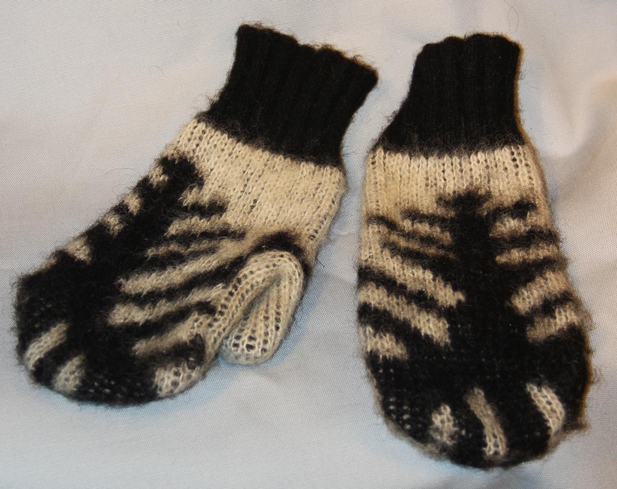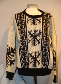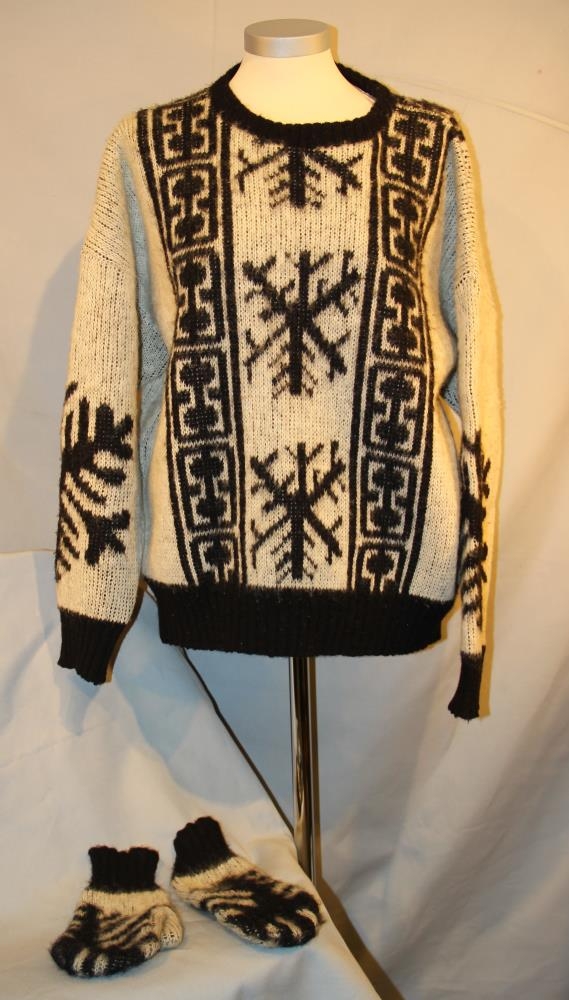 Peysan er ljósgrá með svörtu munstri. Vettlingar eru í sama lit og með sama munstri. Stærð peysu: 52.