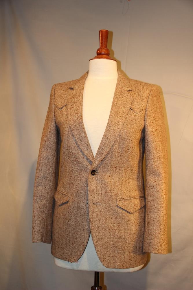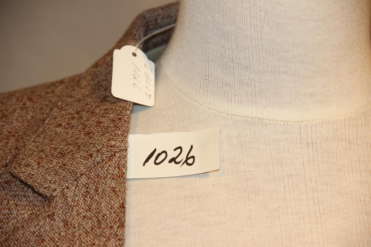 Fötin eru jakki, buxur og vesti. Jakkinn er drapp/rauðyrjóttur úr Terýlíni og á ísaumuðum miða stendur: Terra fyrir herra - Fataverksmiðjan Gefjun. Buxurnar eru brún-/móleitar og einnig framhlið vestisins; sem er úr draloni. Vestið er hins vegar úr mosagrænu prjóni að aftan og með snúningi að neðan og í V-hálsmáli í sama lit og efni. Stærð: Hæfir 14 ára.