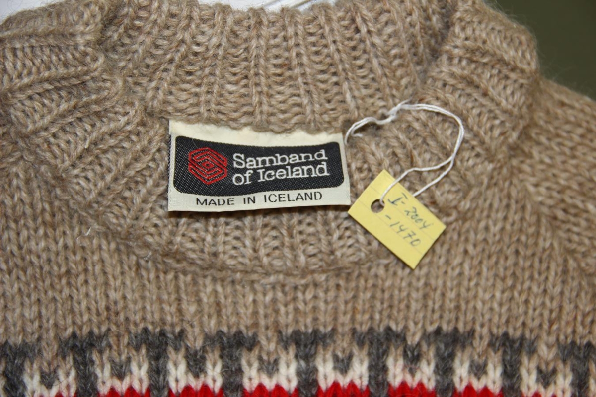 Peysan er mógrá með rauðu, hvítu og gráu munstri. Áletrun á ísaumuðum miða: Samband of Iceland- Made in Iceland. Stærð: Large.