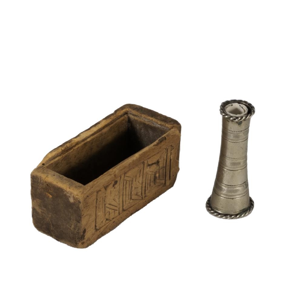 Skúfhólkur. Átti Kristbjörg Jónsdóttir (1851-1927) húsfreyja á Þórustöðum Hvalfj. Strandahreppi, Eftir lát hennar eignaðist dóttir hennar Guðrún Sigtryggsdóttir (1879-1968) húsfreyja á Ingunnarstöðum í Brynjudal í Kjós. Börn hennar gáfu Byggðasafninu hólkinn árið 1971. Er í lítilli tréöskju ágrafinni 7 x 3 x 3,5 cm.
