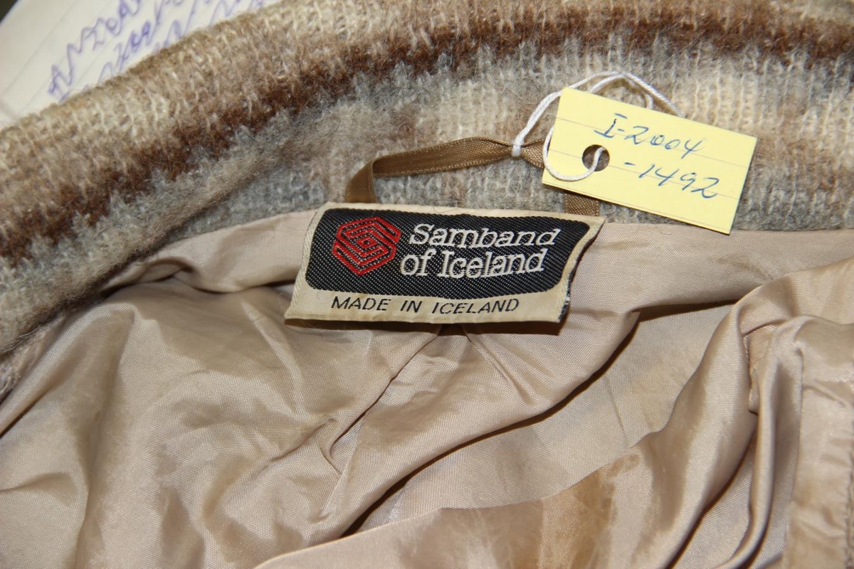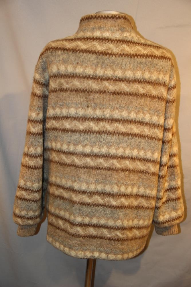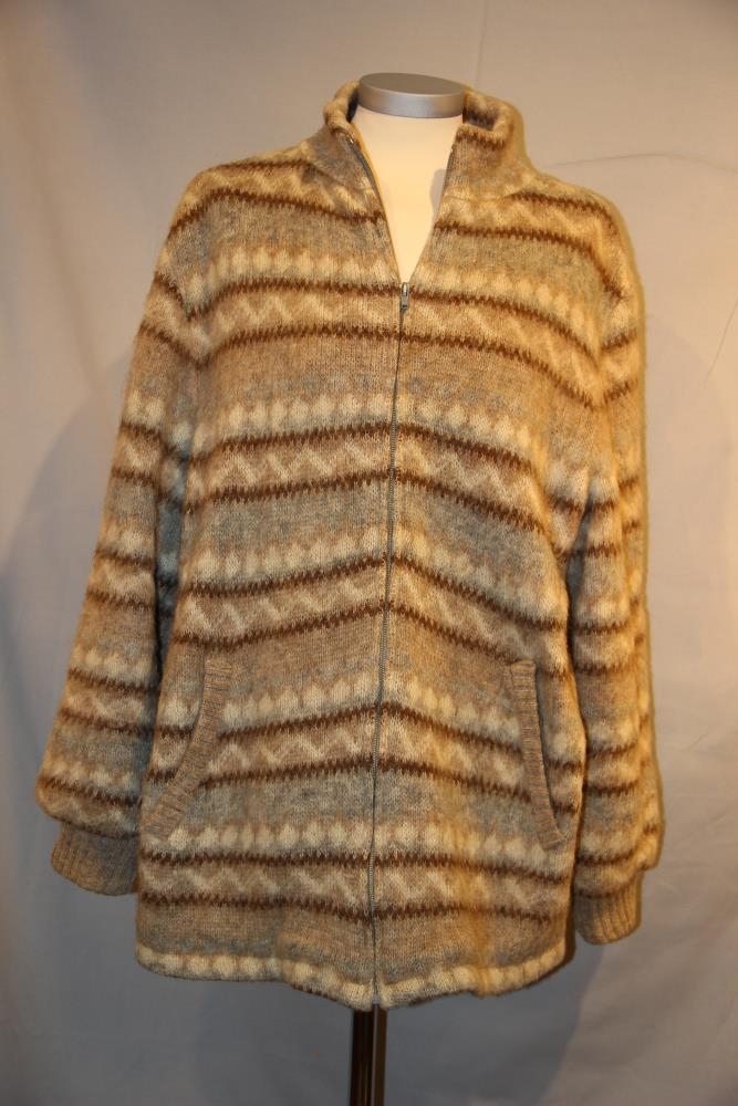 Jakkinn er drapplitaður með þverröndóttu munstri og með rennilás. Stærð: Large.