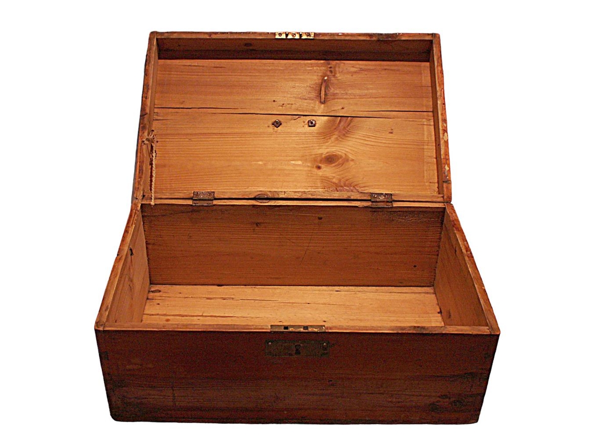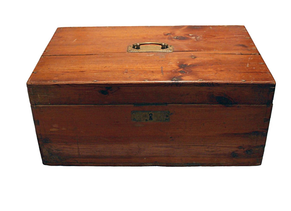 á hornum, með loki og læsingu ásamt koparhöldu. Lakkaður með glæru lakki.