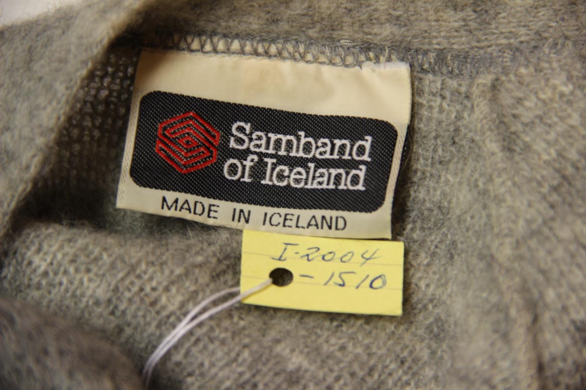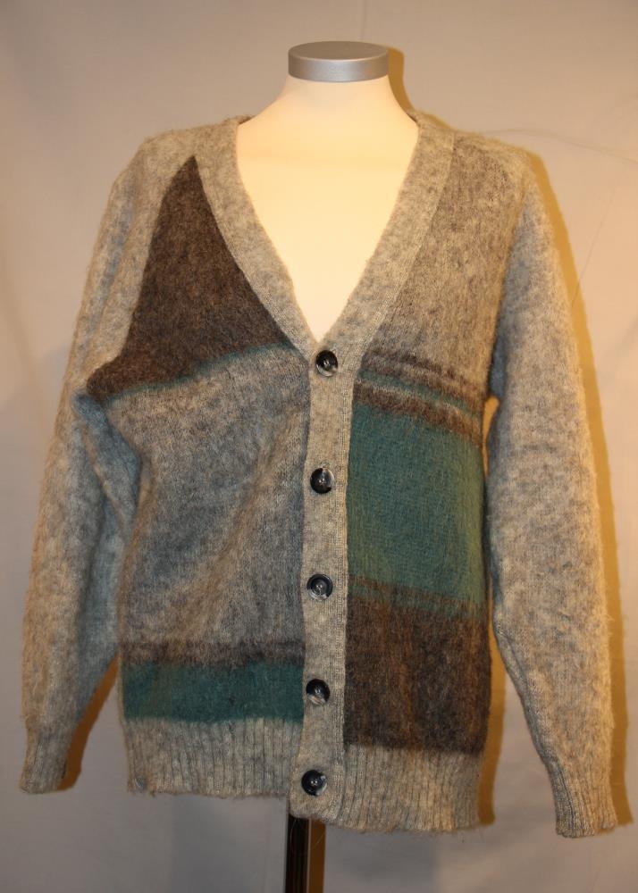 Peysan er grá að lit, með mislitu munstri og hneppt. Stærð: Medium.