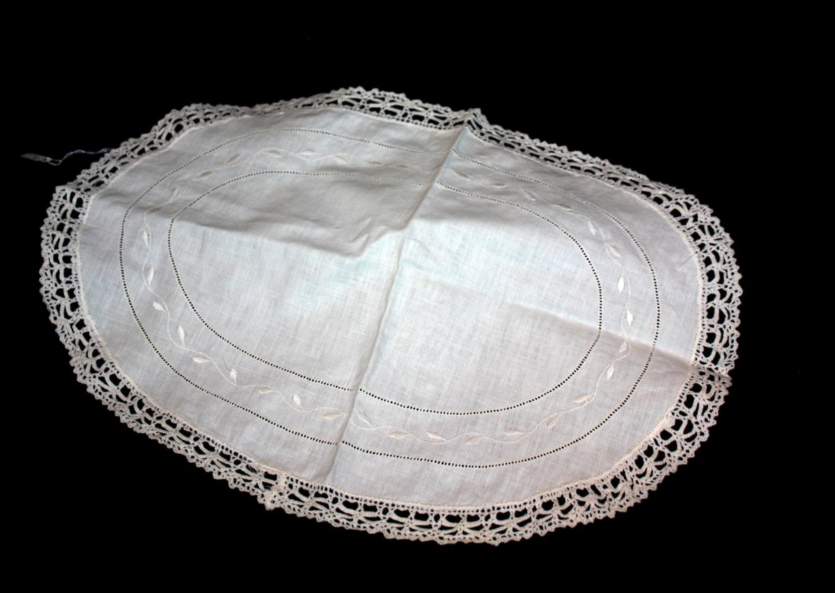 Dúkur, sporöskjulaga hvítur og útsaumaður með blúndubryddingum, 42 x 30 sm. Úr eigu Ragnheiðar Þorgrímsdóttur Thorgrímssen á Grund (f.1845,d.1933), afh. af Ragnheiði Ólafsdóttur sem er barna,barna,barn hennar.