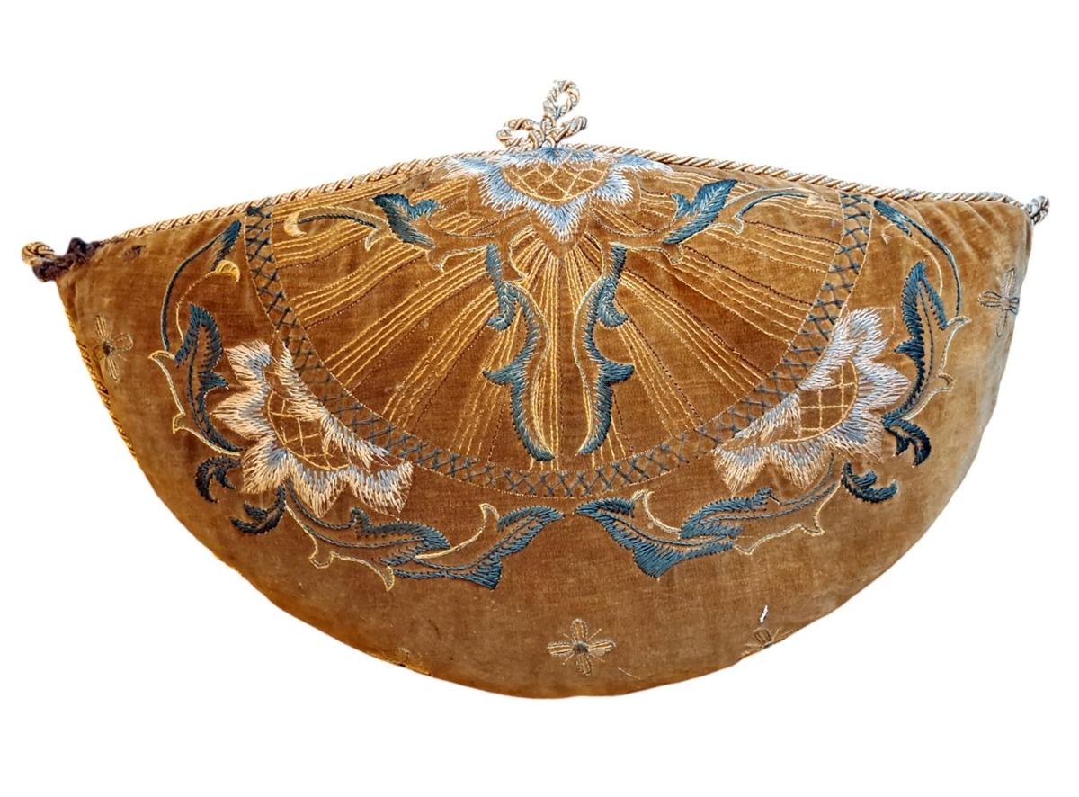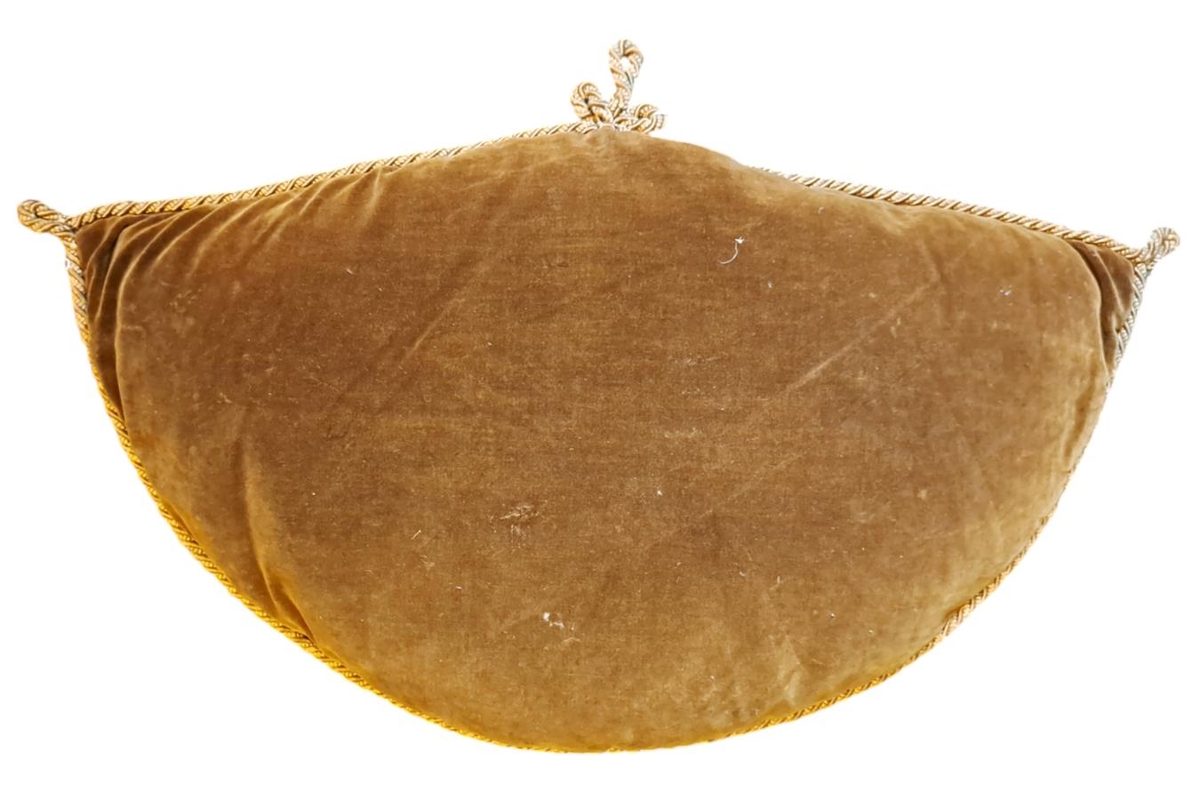Útsaumaður púði, brúnn í grunninn með einskonar kaðalsnúru á brúnum.