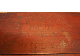 Rauðbrún kista /kassi úr búi Gísla Daníelssonar í Kárabæ á Akranesi. Þetta er kassi sem hefur upphaflega verið undan James Watson & Co Ltd - old Scotch Whiskey - Dundee. Ekki er vitað hvað hann varðveitti í kistunni.