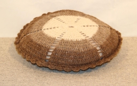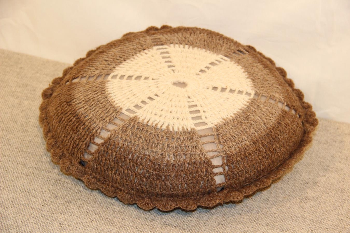 1. púði er í sauðalitunum, hringlaga úr Gefjunargarni. Stærð: 37x12 cm.