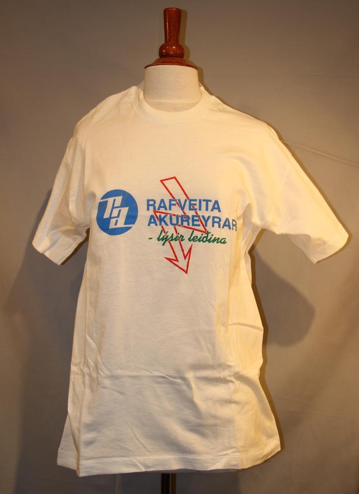 Bolurinn er hvítur og stutterma. Áletrun í bláu, rauðu og grænu er svohljóðandi: „Rafveita Akureyrar lýsir leiðina“. Flíkin er ónotuð. Stærð: Large.