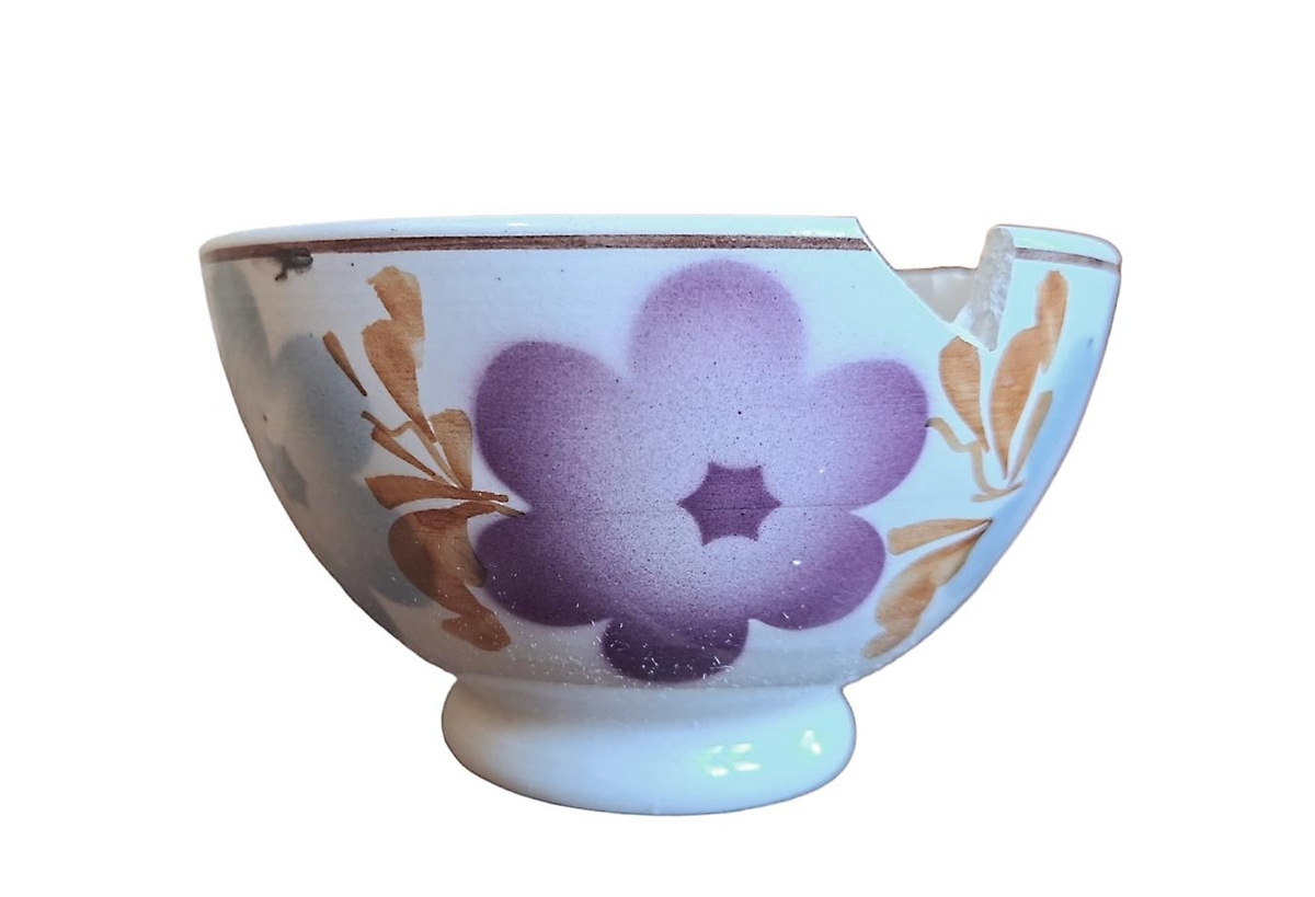 Spilkanna (grautarskál) lítil ,úr hvítum leir,rósmáluð.Úr búi Guðbjargar Sigurðardóttur á Akri.
