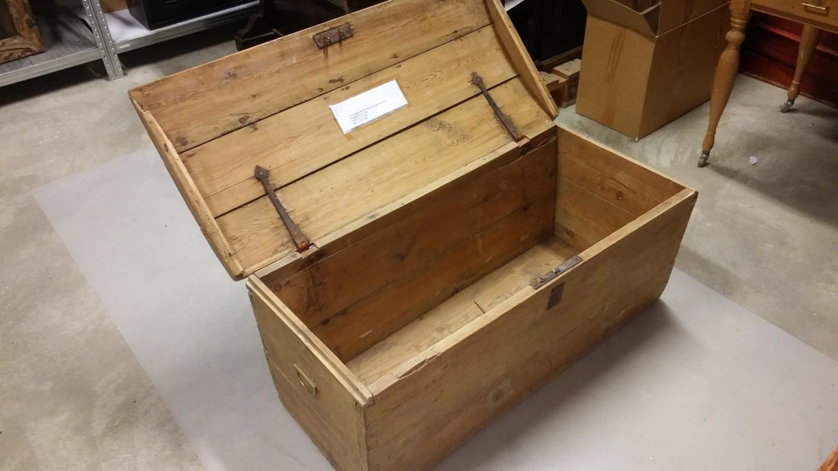 Kista hefðbundin að gerð, ómáluð, með bogalöguðu loki, handföng á göflum, lás, lykil vantar. Stærð 106 sm að lengd, breidd 49 sm og hæð 45 sm.