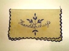 með vélsaumuðu munstri í bláum lit. Í hann er saumað"Heandkerchiefs".