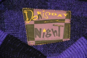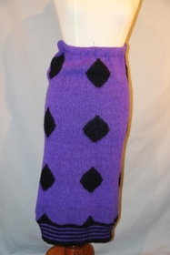 Prjónasettið/dragtin innifelur pils, peysu, jakka og húfu. Texti á ísaumuðum miða: Viola Skagaströnd og Dorys Day and night. Design of Iceland. Litur fatnaðar er fjólublár með svörtu skákborðsmunstri. Stærð: 42.