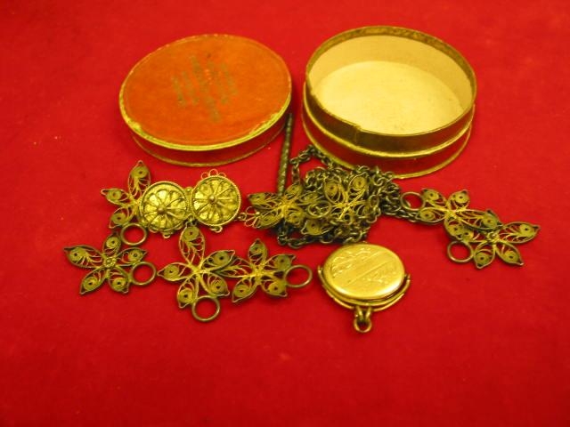 Askja ,lítil rauð á lit. Áletrun: Urasmiður og Juveler Halldór Sigurðsson BOX.34 -Tfl.94, Reykjavík. Í öskjunni eru myllur af upphlut og hálsmen með mynd af Katrínu Oddsdóttur frá Litla-Teig á Akranesi (d.1887). Gef:Ása Ólafsdóttir Finsen (f.1902)