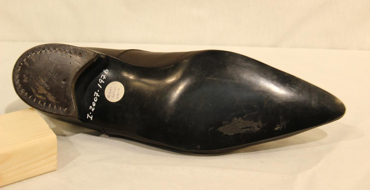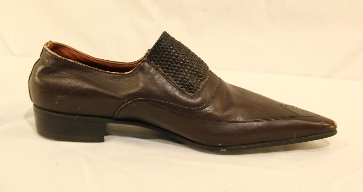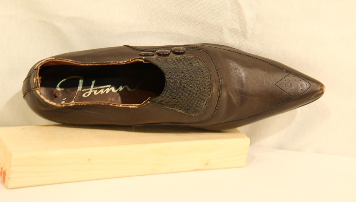 Brúnn leðurskór með plast (nælon)sóla. Skórinn er támjór með teygju á rist og þrjár doppur á hlið til skrauts. Stærð: 40.