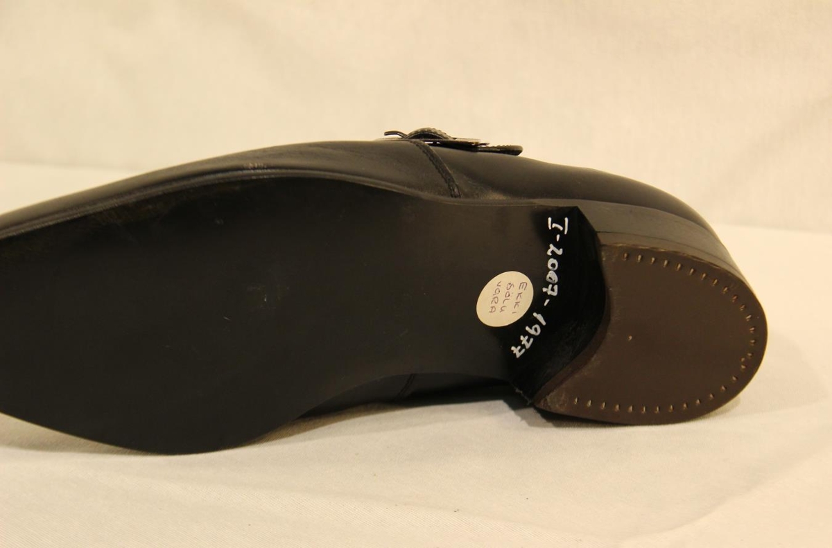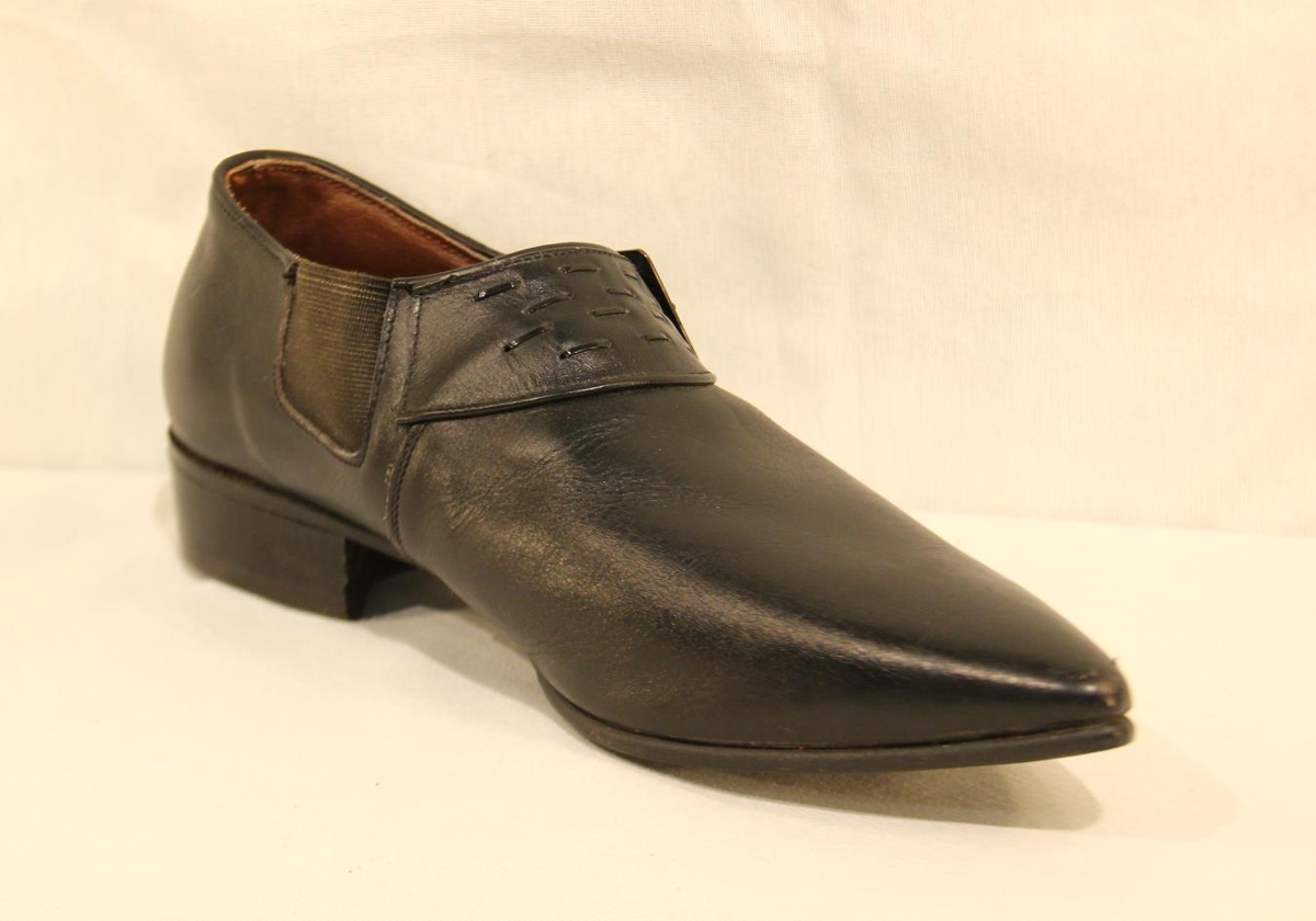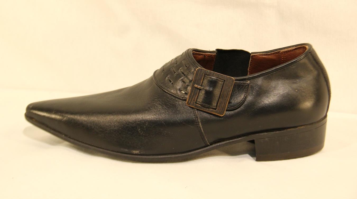 Dökkbrúnn leðurskór með plast (nælon)sóla. Teygja á hlið og spenna að utanverðu til skrauts. Stærð: 7