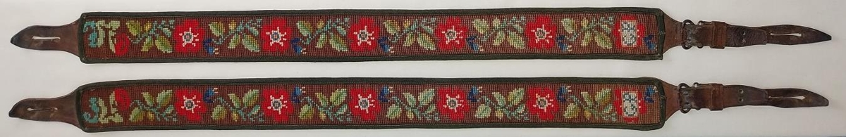 Útsaumuð axlabönd með blómamunstri og fangamarkinu G.P. en Gísli Pálsson í Hoftúni átti þau. Kona hans Guðrún Þórðardóttir saumaði þau.