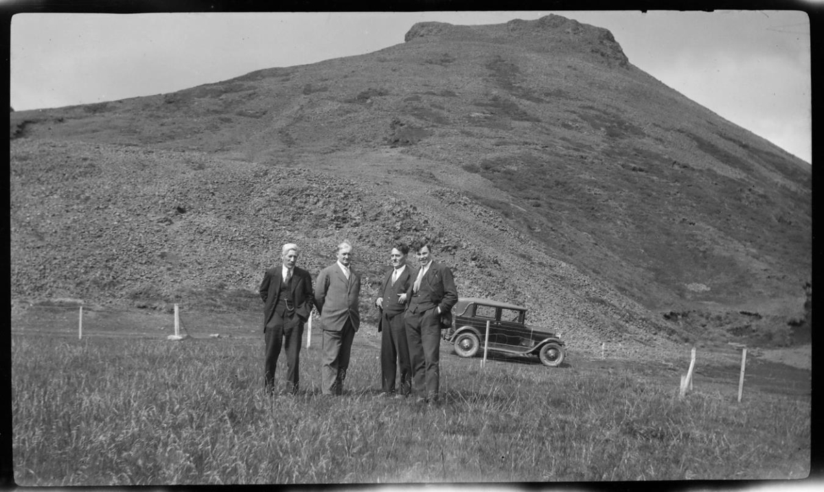 Fjórir karlmenn standa saman. Jóhann I. Jóhannsson annar maður frá vinstri. Bíll og Meyjarsæti í Þingvallasveit í bakgrunni.