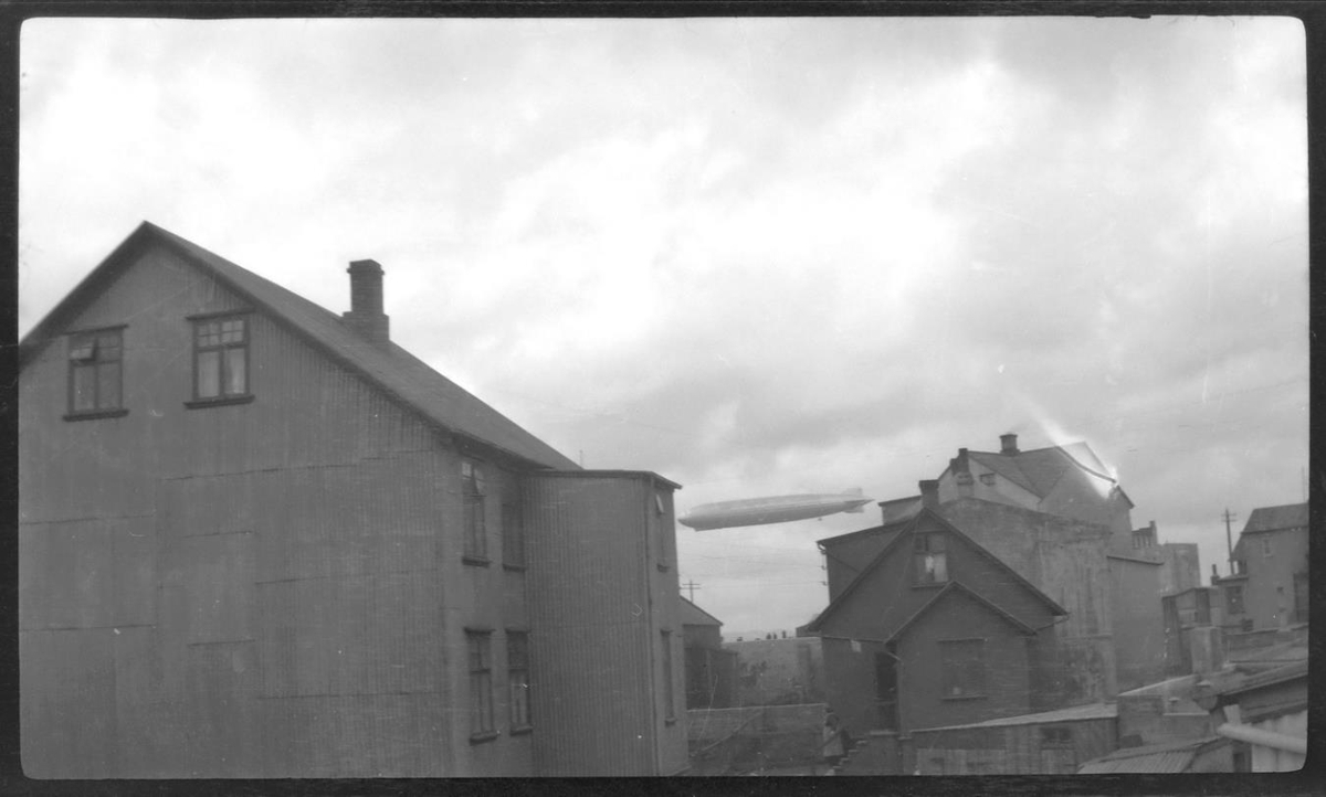 Horft yfir hús í Reykjavík. Loftskipið Graf Zeppelin sést á milli húsþaka.
