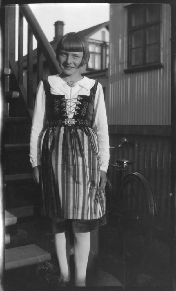 Stúlka á upphlut stendur við tröppur húss, væntanlega Margrét Jóhannsdóttir, dóttir ljósmyndarans.