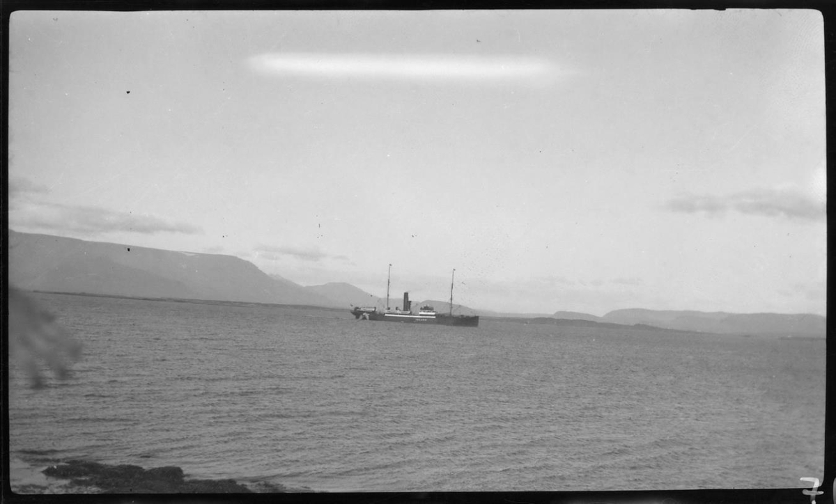 Skip á legu úti fyrir Reykjavík. Strandferðaskip. ISLAND málað á skipshlið.