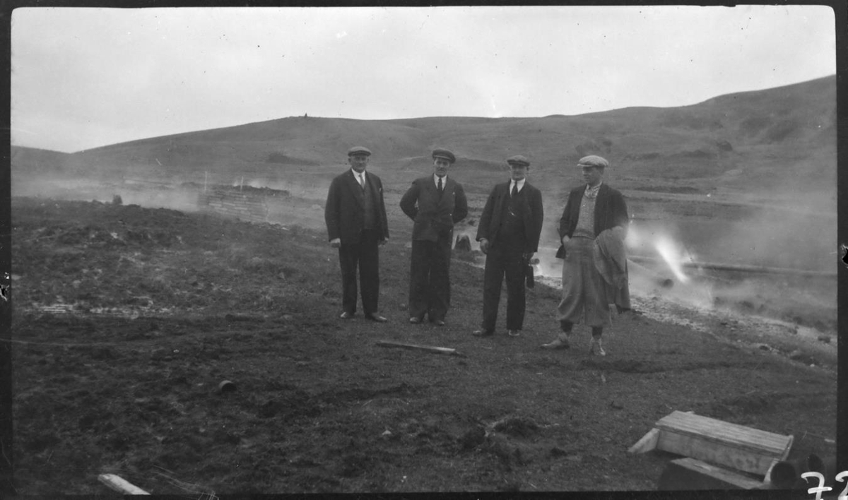 Fjórir karlmenn á óþekktu hverasvæði. Líklega ofan við Hveragerði. Jóhann I. Jóhannsson lengst til vinstri.