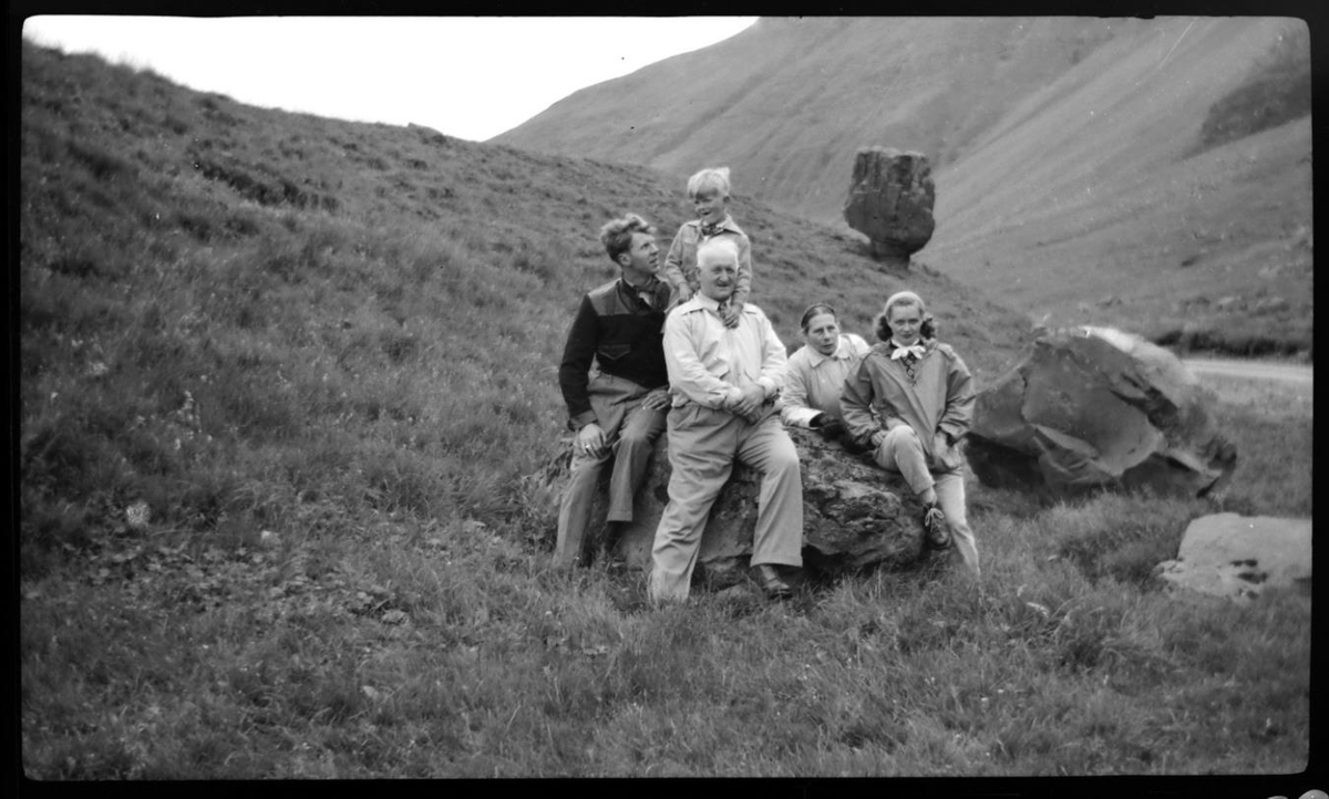 Tveir karlmenn, tvær konur og drengur við staupastein í Hvalfirði. Jóhann I. Jóhannsson situr á steininum og Guðfinna Þorsteinsdóttir hægra megin við hann.