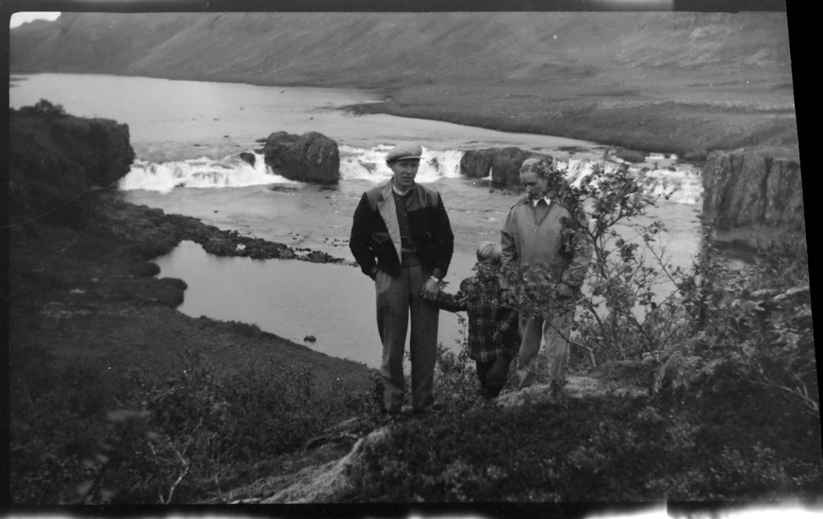 Karlmaður, kona og drengur með Laxfoss í Norðurárdal í Borgarfirði í baksýn.
