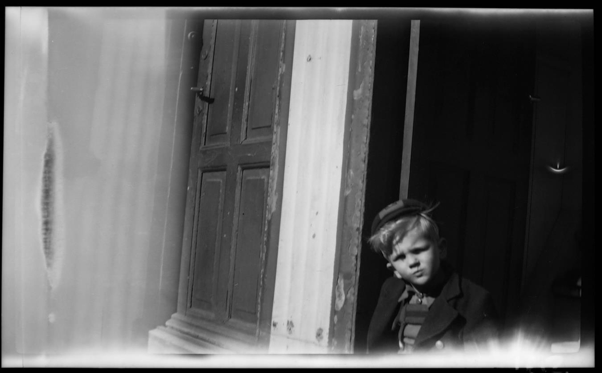 Drengur sést gægjast út um dyragætt. Væntanlega Einar Halldórsson barnabarn Jóhanns.