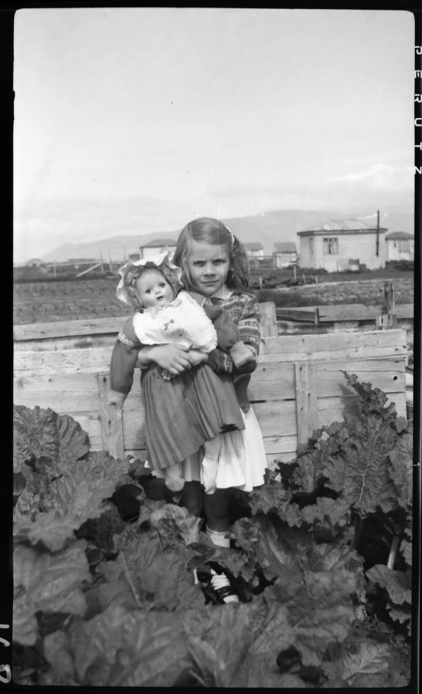 Stúlka, líklega Guðfinna Halldórsdóttir dótturdóttir Jóhanns, með brúðu í fanginu stendur í garði með rabbabara. Bak við hana sjást lítil hús, vætanlega sumarhús í ræktunargörðunum í Kringlumýri.