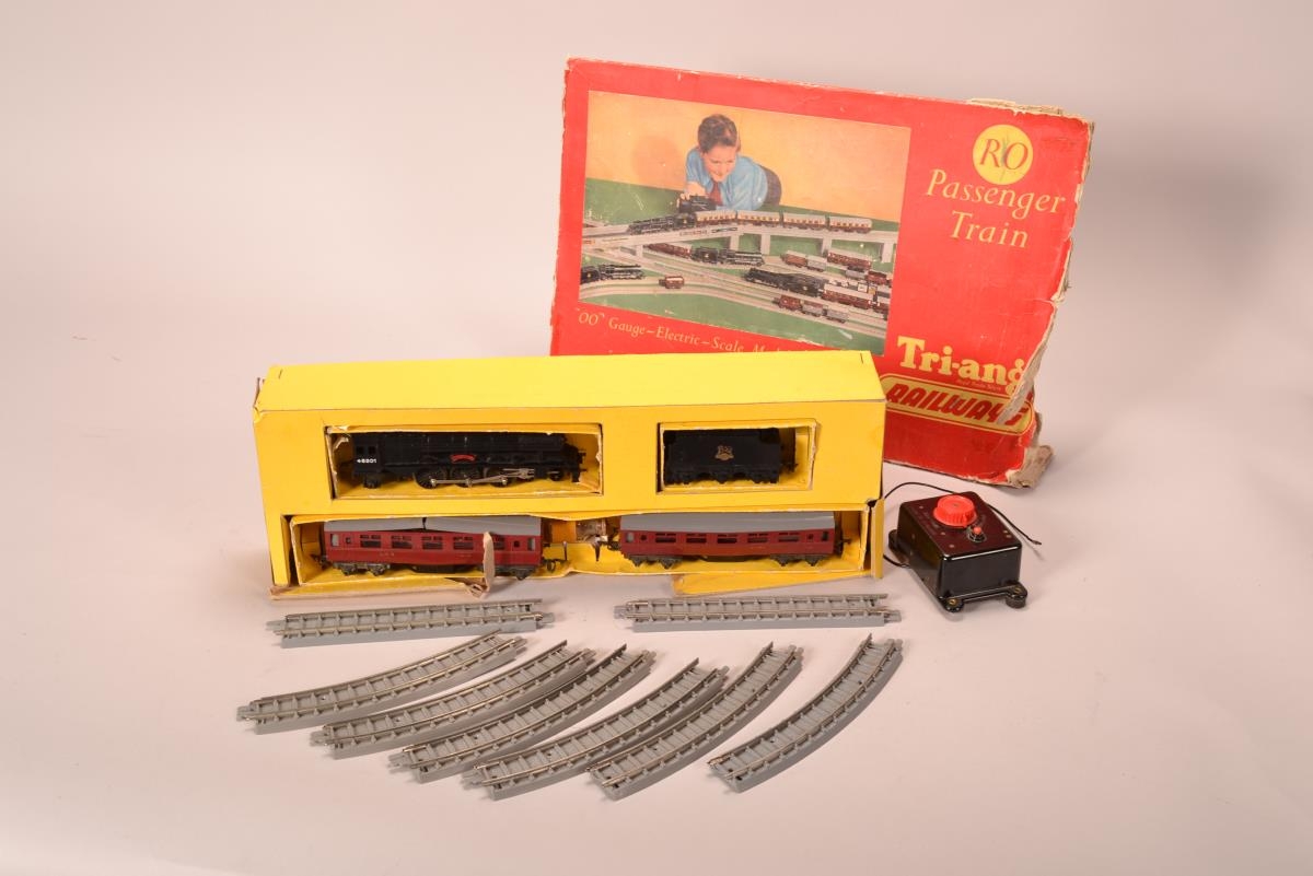 Pappakassi með járnbrautarlest. Teinar og vagnar úr plasti og járni. 1 eimreið, 1 kolavagn og 2 farþegavagnar. Leikfang sem var upprunaleg í eigu föður gefanda, en afi gefanda, Magnús Axelsson f. 11.11.27, keypti dót þegar hann var í siglingum. Börn Þórðar og elsta barnabarn léku með þetta leikfang.