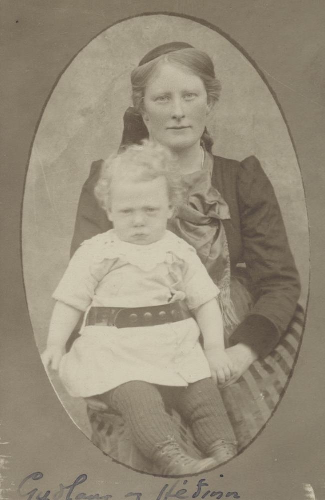 Guðlaug Andrésdóttir húsfreyja í Kerlingardal í Mýrdal með son sinn Skarphéðin Haraldsson.