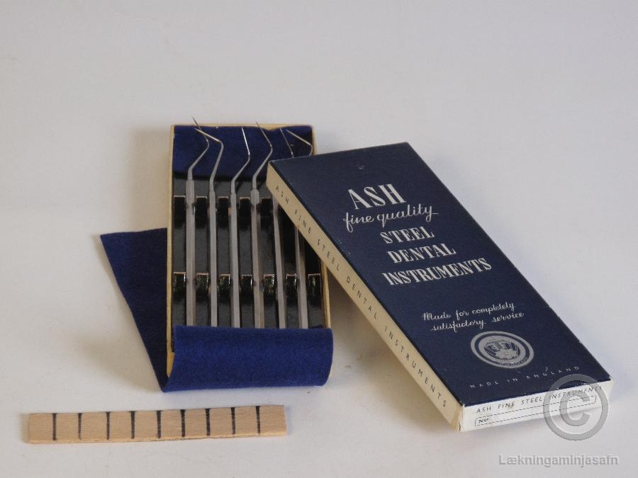 Sex handverkfæri með krókum í pappaöskju og filtdúk. Ætluð til að leita eftir skemmdum í tönnum.