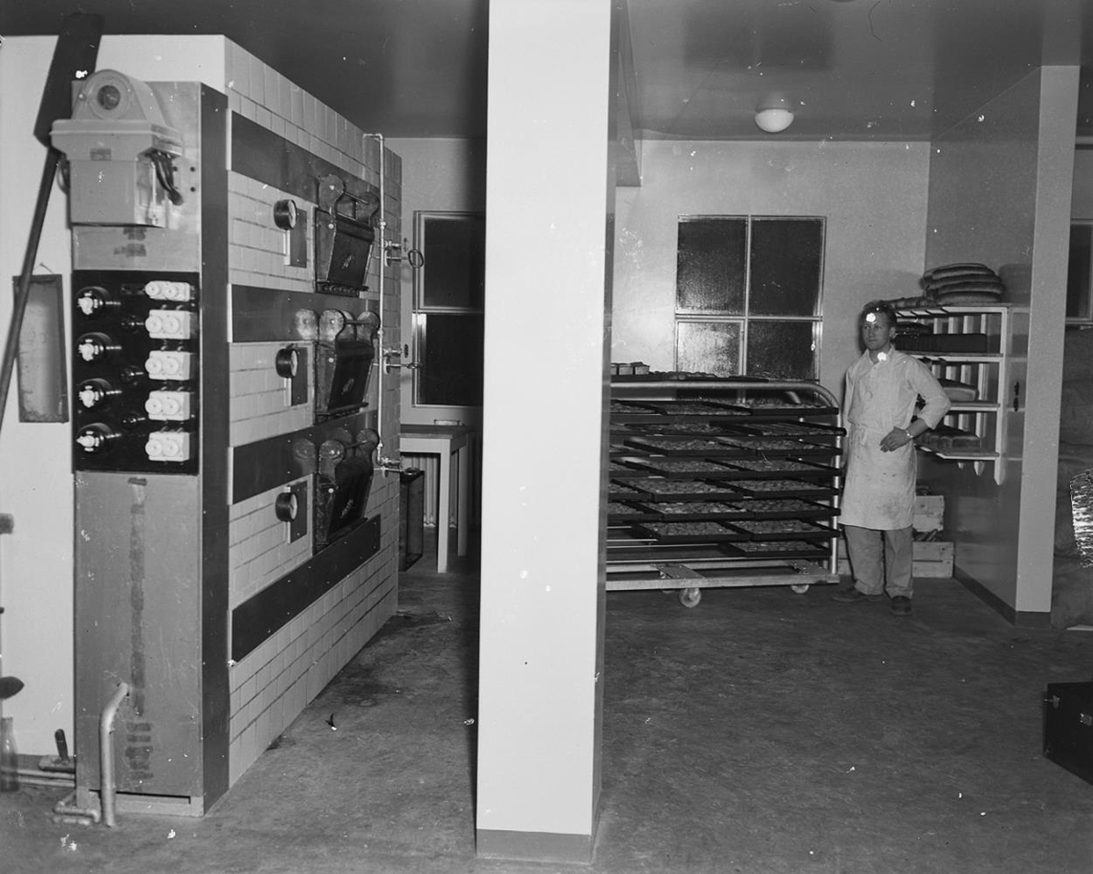 Innan úr bakaríi. Bakarofn innfelldur í vegg. Grindur með bökunarplötum á með bakstri. Maður í hvítum slopp stendur þar hjá.